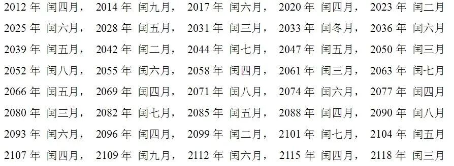 以下为未来约100年农历闰年闰月查询表