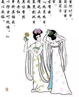 重阳节插茱萸的风俗,在唐代已很普遍。古人认为,在重阳节这一天插茱萸可以避难消灾,所以不少妇女、儿童将茱萸佩带于臂,或插在头上。重阳节佩茱萸,在晋代葛洪《西经杂记》中就有记载。除了佩带茱萸,还有头戴菊花的。唐代已经如此,历代盛行。在清代,北京人在重阳节把菊花枝叶贴在门窗上,“解除凶秽,以招吉祥”。