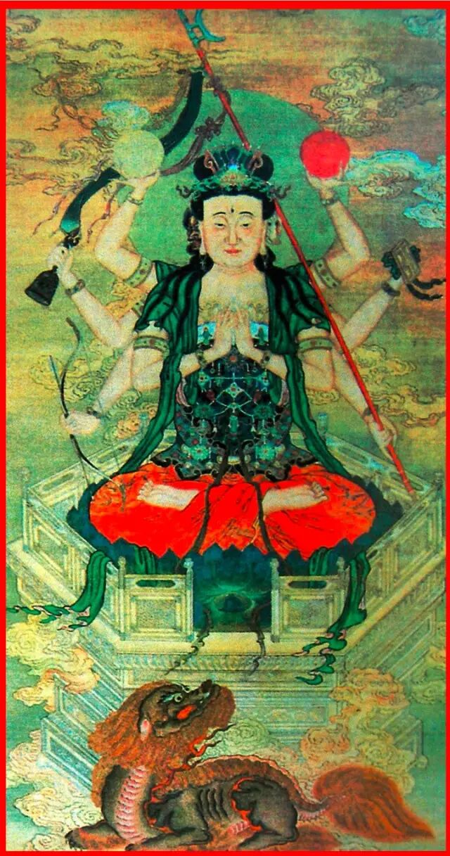 在道教中,斗姥崇拜十分普遍,许多道教宫观都建有“斗姥殿”、“斗姥阁”,专门供奉斗姥。斗姥神像十分威武奇特:头戴紫金冠,额上有三目,其中一目,就是常说的天目,亦即慧目。肩上有四头,其实是一个头而四面有脸。据说斗姥八臂,其中六手臂上举成倒“八”字,执有日、月、星、宝铃、翻天印、戟等器械,另两手合拢掐斗印。正所谓:斗姥妙相紫光圆融,禀一炁玄元之象,应无极生太极也。秉持日月二轮,应阴阳二气,象太极也。四头磊落,应四象也。八臂垂雄,应八卦也。端坐于獬座之上以救度众生,持宝杵以降魔御患,执弧矢以救劫消灾,振法铃以济人度鬼。