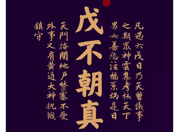 道教规定,逢阴历天干为“戊”之日(六戊:即戊子、戊寅、戊辰、戊午、戊申、戊戍日,这叫“明戊”。)凡遇六戊不朝真,不烧香、不诵经,不供斋设醮上表。停止一切宗教活动,谓之“避戊”。每逢“