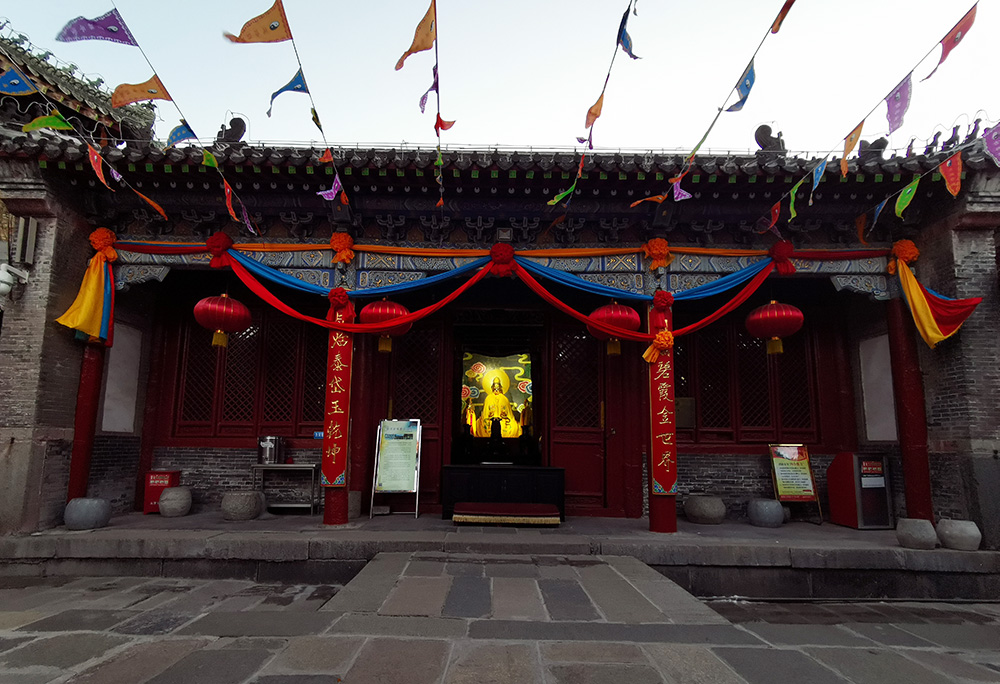 始建于明嘉靖年间,现存主体建筑为清乾隆年间所修。均为面阔三间,长13米,进深7.7米,通高8.4米,四柱五架梁,七檩前后”廊式,重梁起架,五脊硬山顶。檐下施斗拱,柱头科单下昂三踩。斗拱上承托抱头”梁(蚂蚱头状),平身科,单下昂三踩。斗拱上托六分头,檩枋斗拱上饰墨线大点金”彩绘。
