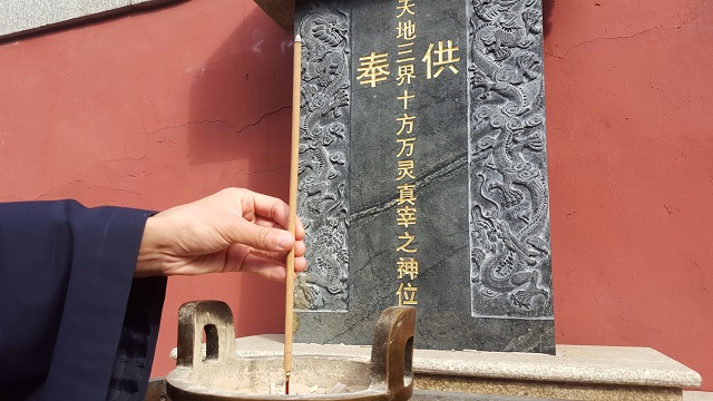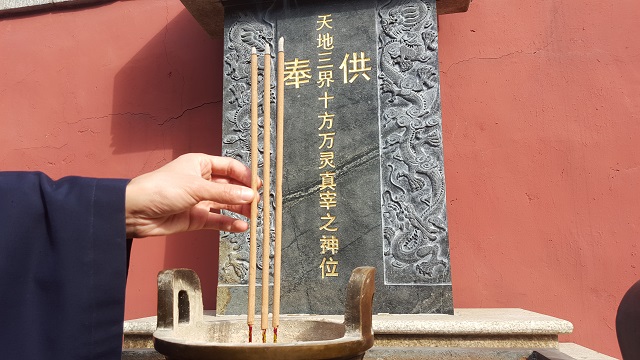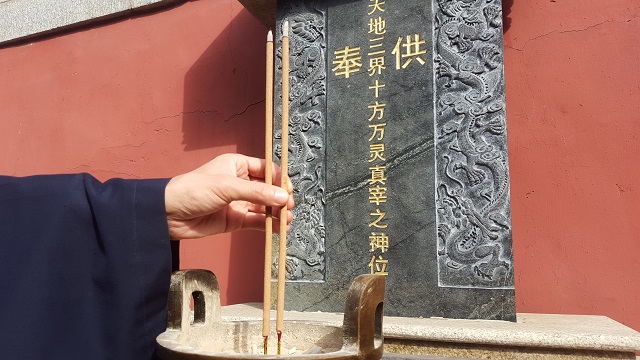 ③然后用左手上香,因为道教以左手为阳左手为净手,而右手操持百事,容易沾染污秽。按先中间、再左(自己右手边)、后右(自己左手边)的顺序分别插入香炉内,三炷要插直插平,插直是要求烧香者心地正直,插平是要求烧香者心平气和。三炷香平列间隔不过一寸宽,则是寸心感神之义。故有“烧香不过寸,过寸神不信”之谚语。