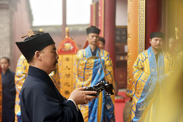 除了学习外,张诚达道长还将爱国主义情怀融入到传统的道教法事活动中去。自古以来就有“泰山安则四海皆安”的说法,泰山道教也就一直有着祈禳国祚的优良传统。有鉴于此,张诚达道长于2013年国庆节发起举行“迎国庆祈国泰民安大法会”,带领碧霞祠道众登坛演法,祝国迎祥。用传统的道教斋醮科仪方式虔诚表达对国家国泰民安、风调雨顺的真诚祝福。从此,这一国庆祈福法会作为一项优良传统在碧霞祠延续下来,成为碧霞祠道众奉行爱国爱教精神的最突出标志,也成为国庆节期间泰山景区的一道亮丽的风景线。