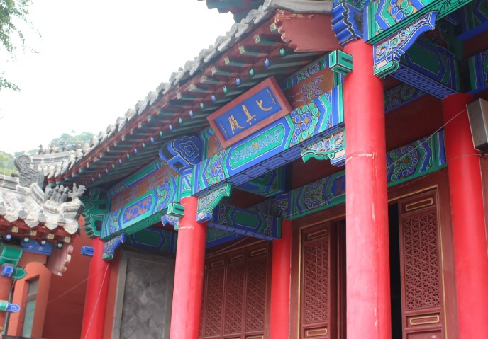 朱漆庙门上,分别镌写着“灵著之山”和“恩覃寰海”八个楷书大字。山门高大崔嵬,他周围环卫着四个将军,手执各种不同的兵刃,神情威猛,令人望而生畏。