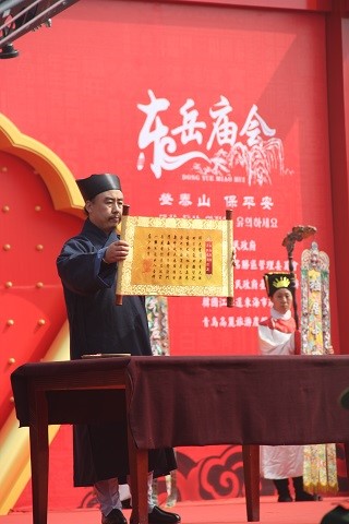 2013年4月24日上午,以“登泰山,保平安”和“逛东岳庙会,祈平安福贵”为主题的2013泰山东岳庙会暨台湾东岳大帝信众泰山行活动启会仪式在泰安岱庙天贶殿举行。