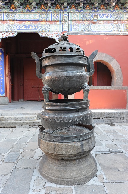 位于碧霞祠院内天启铜碑之南,西御碑亭正东面空地存放。实际上是一铜香炉,是明代嘉靖十九年(公元1540年)北京房山县所献,为泰山现存最早的供器。整座铜炉连座一千斤,故被称作“千斤鼎”。文革时惨遭锤砸,致面目全非。泰山老奶奶的信众经常触摸以期圣母赐福,带来好运。