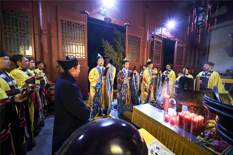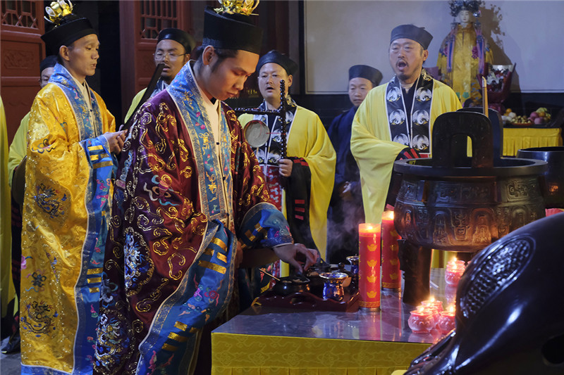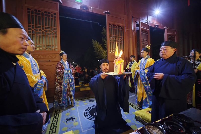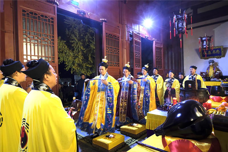 11月10日晚,己亥年下元节前夕,中国道教协会副会长、山东省道教协会会长、泰安市道教协会会长张诚达道长率泰山道众,谨按道教传统,在泰山灵应宫举行下元五炁解厄水官圣诞祝寿祈福法会。