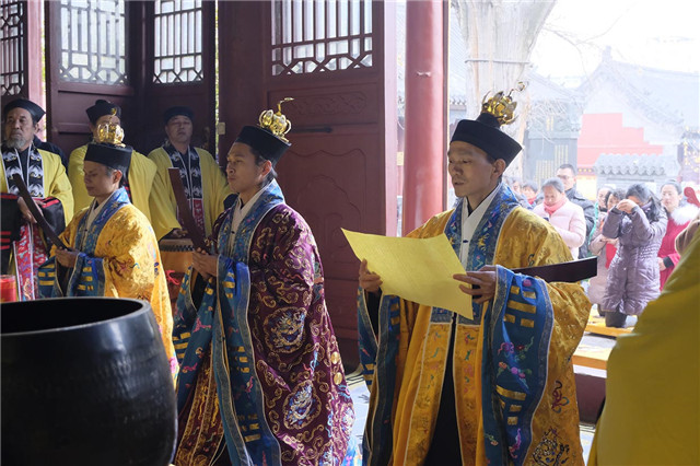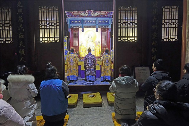 22日上午9时,中国道教协会副会长、山东省道教协会会长、泰山碧霞祠、泰山灵应宫住持张诚达道长率泰山道众,在灵应宫大殿整列朝班,讽经演教,庆贺元始天尊圣诞。