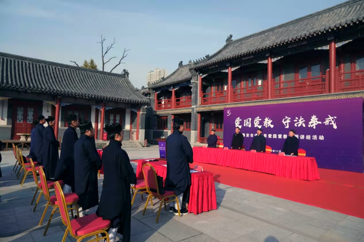 上午9时,在泰山道教文化馆内的讲经现场,全体参加人员肃立奏唱国歌,向祖国致敬,正式拉开爱国爱教主题讲经活动的序幕。