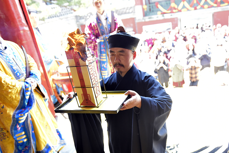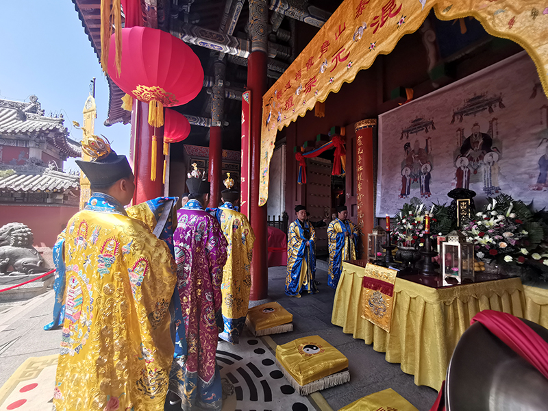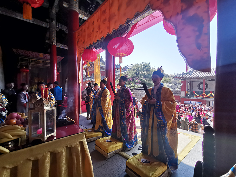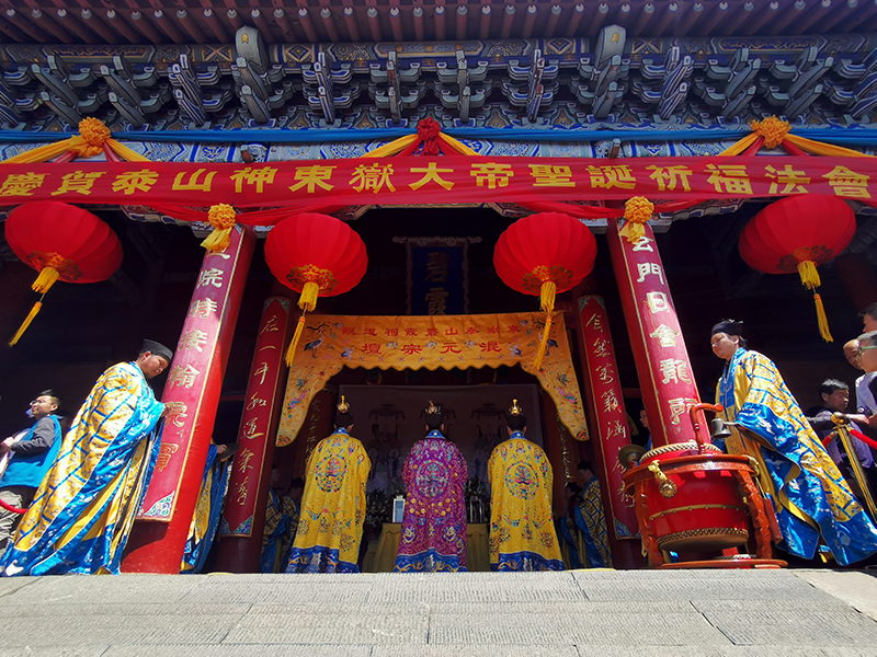 5月2日,适逢己亥年三月廿八,是泰山神“东岳大帝”之诞辰。东岳大帝,道教尊称为中界至尊东嶽大生天齐仁聖帝威权自在天尊。是日上午十时,泰山碧霞祠住持张诚达道长率本观道众及十方善信人等,齐集山门,恭设法坛,谨按道教传统讽经演教,焚香进疏,庆祝圣寿,祈福迎祥。